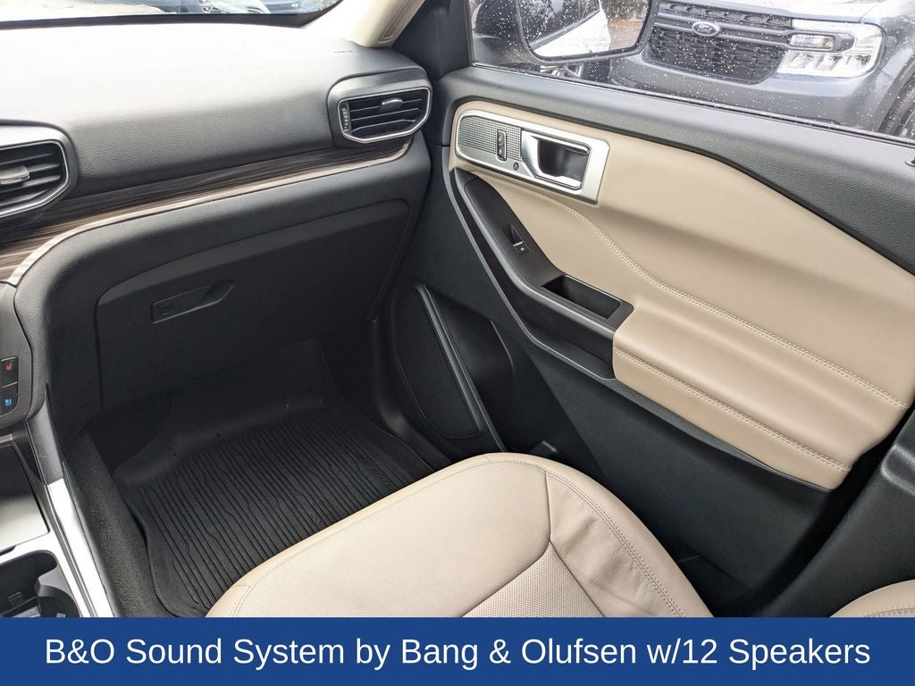 Inside, this Explorer is designed to keep everyone comfortable with heated and cooled leather front seats, heated second-row seating, and a powerfold third-row bench for added flexibility. A twin panel moonroof fills the cabin with natural light, while the heated steering wheel, wireless device charging, and a 110V power outlet add everyday convenience. The B&O sound system with 12 speakers delivers rich, immersive audio throughout the cabin.