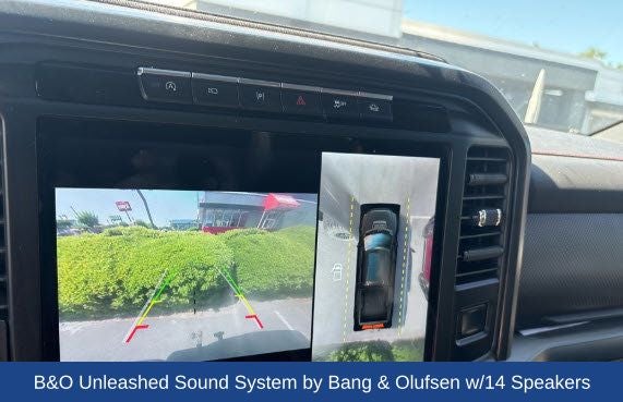 Advanced technology includes a 360-degree camera and backup sensors for improved visibility, along with Pro Trailer Backup Assist and Pro Trailer Hitch Assist to make towing easier and more precise. Adaptive cruise control enhances highway driving, and the B&O Unleashed audio system with 14 speakers delivers a rich, immersive listening experience.